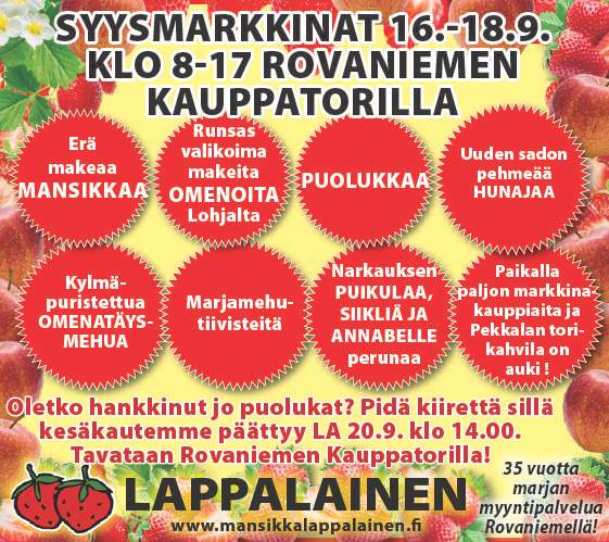 Kesäisin syksyyn asti myymme tuoreimmat mansikat ja muutkin marjat ja vihannekset Rovaniemellä.